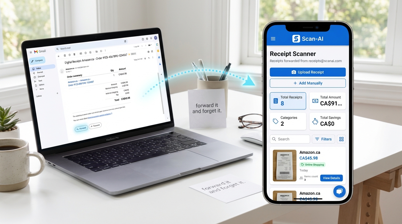 You get a unique @scan-ai.ca address when you sign up. Forward any email receipt to it — Amazon orders, SaaS subscriptions, contractor invoices.